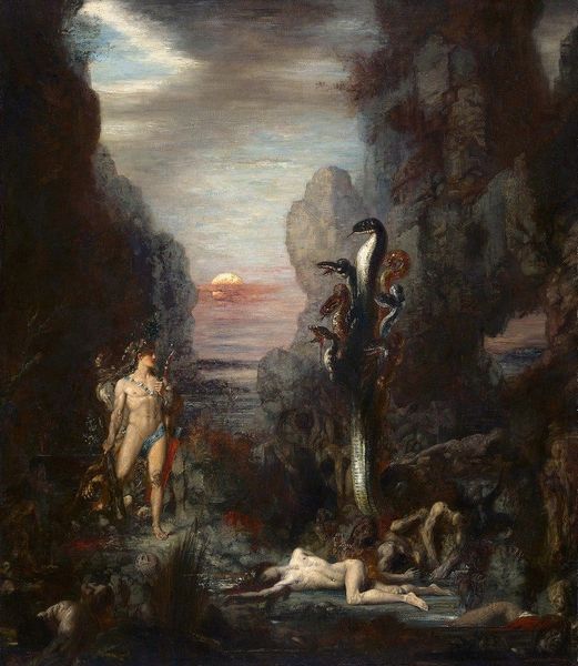 Editor: This is "Dejanira," an oil painting by Gustave Moreau, created around 1872-1873. There's a really turbulent feel to it, with this woman, presumably Dejanira, being carried away through this almost overwhelming landscape. How do you interpret this work, looking at it purely from a formal perspective? Curator: Indeed, the landscape dominates. Note how the composition uses a vertical format, emphasizing the towering cliffs and trees, creating a sense of confinement. Moreau’s brushstrokes are quite loose, almost dissolving the forms, which contributes to that feeling of turbulence you observed. Look closely at the limited palette: predominantly earth tones and muted blues, which reinforce a mood of foreboding. What effect does the relative lack of sharply defined lines have, do you think? Editor: It feels like everything is in flux, unsure, and slightly out of control, not quite crystallizing for the viewer. It mirrors what Dejanira must be feeling, actually! Curator: Precisely! And observe the contrast. Dejanira's pale skin and white drapery create a focal point. Her upward reaching arm, balanced by the Centaur’s powerful, horizontal form, makes an X shape, intersecting near her heart. This draws our eye to the emotional center of the piece and the very moment of crisis. What is the relevance, aesthetically, of her pale skin in relation to the more earthy tones of the composition? Editor: It contrasts! She’s also partially unclothed and lighter, and it feels as though her presence, by being the main light focus of the composition, invites you to think she's out of place and shouldn't be there. It adds to her tension. That limited colour scheme emphasizes her pale figure even further. Curator: Exactly. Moreau’s technique creates both visual tension and invites introspection, allowing the viewer to grapple with the formal structure itself. Editor: I see it now! By focusing on the structural and material components, Moreau's symbolic intentions are cleverly revealed!