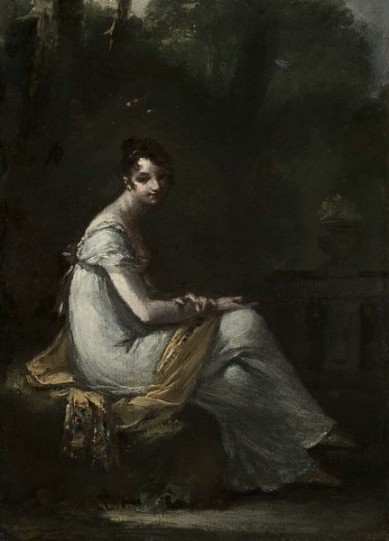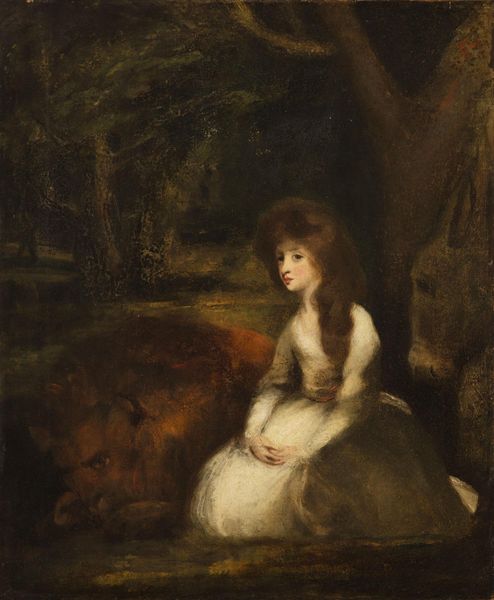 Joshua Reynolds made this oil painting of Mrs. Susanna Hoare and Child sometime in the 18th century. Reynolds, who had an academic background, often chose to work with oil paint, a classic medium of the fine arts. Yet, to consider this work's materiality, we must also look beyond the paint itself. See how Mrs. Hoare is portrayed with her child in an informal outdoor setting. Her dress, while elegant, has a casualness to it. Her clothing, like the setting, evokes a sense of the everyday. Reynolds uses light and shadow to highlight the folds and textures of the fabric, drawing our attention to the material qualities of the dress itself. The textile's textures point towards the wider world of labor and commerce during the 1700s. The raw materials would have been sourced from afar and manufactured in Britain. The dress acts as a potent reminder of the economic systems that shaped British society at the time. Looking at the whole picture, this painting invites us to consider the intimate connection between art, materials, and the social realities of its time.
