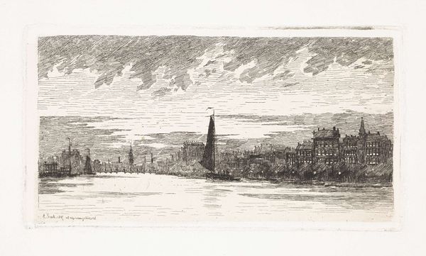 Editor: This etching, "Dorp aan de Vecht," is by Maurits van der Valk, and it’s dated between 1867 and 1931. It shows a small town across a body of water, and it has a quiet, almost melancholic mood to it. How do you interpret this work within its historical context? Curator: Considering its time, the late 19th and early 20th centuries, it's crucial to examine the public role of landscape art. Etchings like these gained popularity, not just for artistic expression, but as accessible images for a growing middle class. Van der Valk captures a Dutch Golden Age style landscape. Does it evoke any specific nationalistic sentiments to you, considering the rise of national identity during that period? Editor: It does, especially with the prominent church spire, typical Dutch buildings and serene water. Do you think the reproducibility of etchings influences its cultural significance? Curator: Absolutely. The reproducibility democratized art ownership. It was less about the singular masterpiece and more about widespread cultural imagery. Think about it: images like these shaped how the Dutch populace saw and understood their own environment. The etching’s distribution impacted the national identity of what was beautiful about the Dutch landscape. Did similar trends emerge in other countries? Editor: Definitely. We see it with landscape painting in America, shaping ideas of westward expansion. Curator: Precisely! These works functioned within networks of cultural production and distribution, influencing and reflecting societal values and political aspirations. This quiet scene holds a surprising amount of cultural power. Editor: That gives me a new way to consider it, as something more politically charged than I initially thought. Curator: Seeing it in that lens truly elevates the piece.