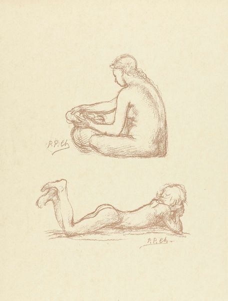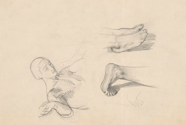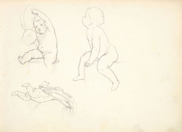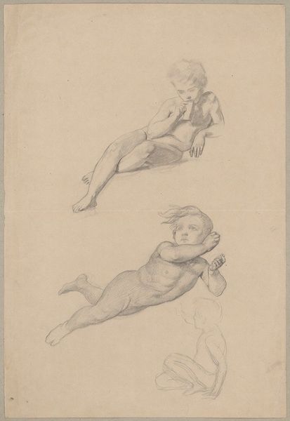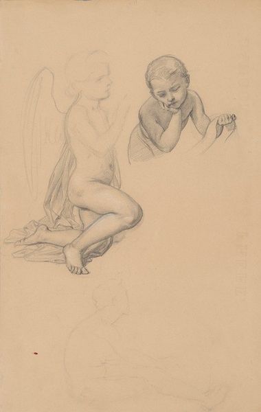 Editor: Here we have Jozef Simmler’s "Nude studies of boys for the figures of angels in the painting ‘The Immaculate Conception of the Blessed Virgin Mary,’" created in 1864 using pencil. They seem very fragile, preliminary sketches. What's your read on this piece? Curator: I see this not just as a preparatory sketch, but as a vital record of labor. Think about it – Simmler employed these boys, they posed, he meticulously drew. This highlights the means of production of religious imagery. What kind of exchange took place in the studio space? Editor: An exchange? You mean beyond just posing? Curator: Precisely! These nude studies were meant to be transformed into ethereal beings. What does the raw materiality of the human body, specifically the bodies of working-class children, tell us about the social construction of the "angelic"? What was the going rate for models at the time? Editor: Interesting, so you are suggesting the economic and social context heavily informs even something that seems so, well, heavenly. I guess the availability of pencil, the accessibility of paper... even these influence the creative output. Curator: Absolutely. And the choice of boys—their youth, vulnerability—impacts how we interpret the final religious work. Who was allowed to pose nude and for what considerations? Think about it - the "divine" emerges through very earthly transactions and the labor of vulnerable bodies. The paper wasn’t cheap back then either, do we know what he earned and how many studies he produced? Editor: That certainly shifts my perception. I was focused on the artistry, but the social context adds so much more depth! Thanks! Curator: My pleasure! Always consider what lies beneath the surface; the production process is never neutral!