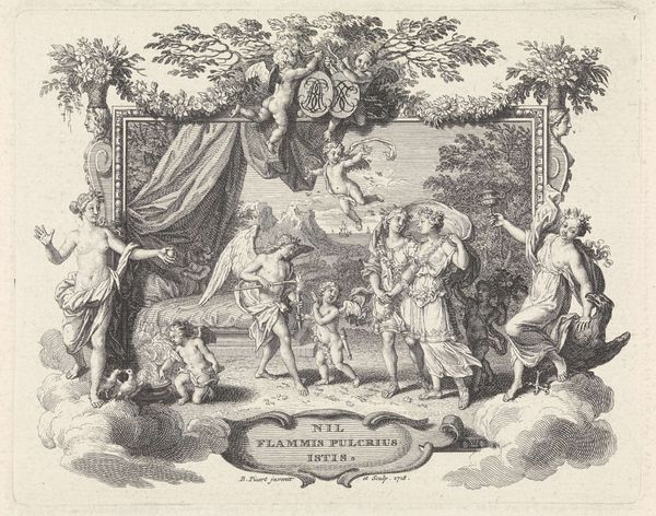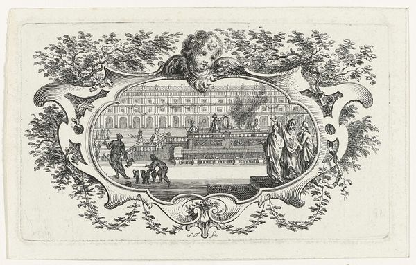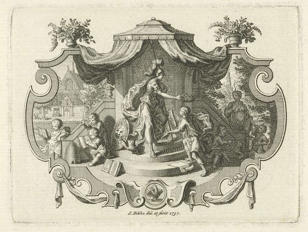 Editor: This is "Allegorische voorstelling 'Minerva Duce'," an engraving made in 1727 by Frederik Ottens, currently housed in the Rijksmuseum. The rendering is beautiful, but there is something about the subject matter I do not fully grasp. What do you see in this piece? Curator: It is fascinating, isn't it? Beyond the Baroque style and allegorical theme, let's consider what Minerva, the Roman goddess of wisdom and strategic warfare, represented in the 18th century. Often, these depictions were linked to societal ideals, especially regarding knowledge and power. Who benefits from knowledge? Who is denied it? These are important questions we need to ask when we look at historical representations of such figures. Notice also the cherubs carrying books, almost laboriously; is this perhaps commentary on access to knowledge and the weight of tradition? Editor: That's a fascinating perspective. So, beyond a simple celebration of wisdom, this could be interpreted as a commentary on the accessibility and burden of knowledge? The racial diversity of the cherubs might also relate to the accessibility you mention? Curator: Precisely. The seemingly innocent image contains multitudes, particularly if we consider it within the socio-political context of the Enlightenment. The depiction of the figures and city architecture is idealised, however that would necessarily correlate to actual contemporary demographics. Do you think it is a reflection on access to opportunity and knowledge? Editor: I had not considered it that way, but now it's a really insightful and complex piece, hinting at deeper questions about power and knowledge beyond its surface representation of wisdom. Curator: Indeed. Examining art through the lens of its time reveals the complex interplay of power, identity, and social commentary that often lies beneath the surface.