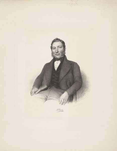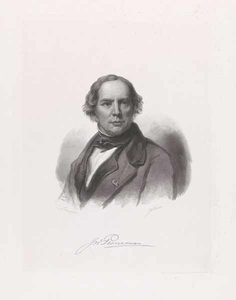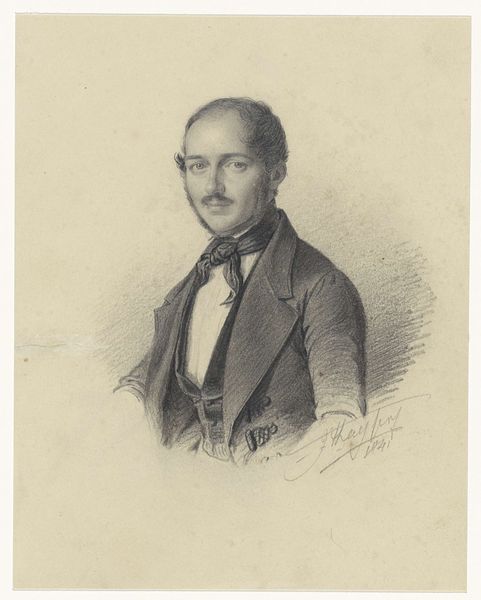 Curator: This is "Portret van Willem Vrolik," an evocative drawing created sometime between 1824 and 1845. Editor: It’s remarkably gentle; the soft lines and the overall grayscale give it such a calm, reflective quality. Curator: Absolutely. The portrait captures Willem Vrolik, a prominent Dutch scientist. The artist, Henricus Wilhelmus Couwenberg, employed graphite and charcoal, techniques that lend themselves beautifully to the Romantic style flourishing at the time. Romanticism prioritized emotional intensity and individualism, often focusing on the inner lives of their subjects. Editor: Indeed. And Couwenberg has captured this gentleman in a three-quarter pose with wonderful symmetry; his eyes are aligned perfectly with the center. Notice the contrasting textures he's rendered—the smoothness of the face against the more stippled treatment of the hair. It really emphasizes the interplay of light and shadow. Curator: That interplay is crucial! It shapes how we understand Vrolik within the context of scientific advancement and emerging bourgeois power. He is a figure of authority and knowledge production, embedded within structures that privilege a certain class. His posture and dress denote status. His engagement with scientific study aligns with a period of rational and empirical progress, albeit progress tied to specific socio-political interests. Editor: The rendering of that suit jacket, with the carefully placed pins and buttons, has such formality and precision. The fabric seems almost tangible! And the slightly smudged quality to the background almost makes him appear as though he is fading out or emerging forth simultaneously. It certainly amplifies that feeling you pointed out, regarding both knowledge and power. Curator: I find the work speaks volumes about societal constructions. What did it mean to be a scientist in the Netherlands during the early to mid-19th century? How does the artist represent or perhaps even challenge normative notions through Vrolik's representation? These inquiries pull me into richer understandings. Editor: For me, it all comes back to the pure craftsmanship, the technical proficiency used to convey form and feeling with such restraint. It's in these visual subtleties that the artist truly conveys meaning. Curator: And I appreciate how this portrait continues to spark discussions on class, power, and representation through these different techniques that we have both analyzed today. Editor: Yes, a captivating dance of skill and sensitivity. It is a marvel indeed.