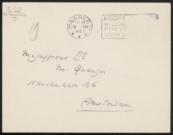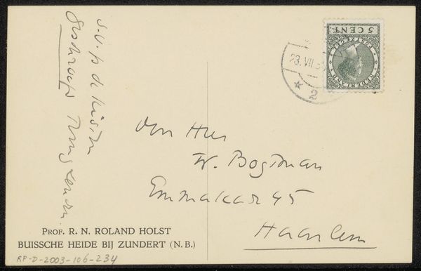 Curator: We’re looking at “Briefkaart aan Willem Bogtman” a pen drawing on paper by Richard Nicolaüs Roland Holst. While undated, the postmark suggests it was sent around 1935. What catches your eye? Editor: There’s a certain melancholy to it, isn't there? Like glimpsing a forgotten correspondence across time. The handwriting itself, elegant but rushed, hints at a story, a connection between these two individuals in a specific social context. Curator: Indeed. Holst, known for his socialist leanings and his work within the Dutch Arts and Crafts movement, occupied an interesting space in Dutch cultural history. Considering this, does the content of this message inform or expand your view? Editor: Absolutely. Without knowing the contents of this postcard, it functions simply as an artifact. But what could this brief note between them reveal about artistic collaborations or resistance efforts, maybe some undercurrents within artistic circles amidst the rising tensions of the 1930s? The hurried style suggests perhaps that discretion was called for... Curator: That is certainly compelling to consider. Holst did indeed cultivate connections within leftist circles. There were the workshops he operated based on socialist ideas. Given the period, its understandable to perceive anxiety as a primary facet of that connection. Editor: It makes one wonder, who was Willem Bogtman? The drawing, as a surviving record, pulls us into these questions. Perhaps, the relative obscurity of a character in the history like Bogtman is just the right narrative to unravel the role of everyday communication in shaping political opinion. Curator: I concur entirely. The immediacy and the intimate nature of this postcard brings us much closer to both men in a social and historic context than monumental artwork ever could. It serves as a portal into their world, far away and yet intimately close. Editor: Exactly. It prompts us to think about how seemingly mundane objects can hold significant historical and cultural value, enriching our understanding of intersectional, often silenced stories. A brief window into history is always a valuable glimpse.