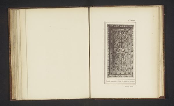 Editor: Here we have an image of a gelatin silver print of the "Grafmonument van het echtpaar Cassiers in de kerk van Houthulst, België," dating from before 1896. It's basically a photo of architecture, the architectural photograph neatly presented on a page of an album. It feels kind of academic to me, like a visual record. What grabs you about this image? Curator: You know, that academic feel you picked up on resonates with me, like thumbing through a historical archive. There’s something ghostly in capturing a monument built for those who are gone. Notice how the photographer has framed the scene to accentuate the monument's placement within the larger church? Are we meant to appreciate the artistry of the tomb, or the context within a space of worship? Editor: That makes sense. I didn't consider the church as a whole. What’s interesting is how crisp the architectural detail looks despite it being over a century old. What's the printmaking add to the memorial? Curator: Photography in the late 19th century was finding its feet, attempting to mimic painting's emotional depth while also establishing its capacity for documentation. The choice to photograph a memorial... what does it immortalize? It feels like the Casier’s memory is doubled here – rendered permanent in stone and preserved in print. I almost feel as if by flipping the album's page, I would release their names back into the shadows! Do you get that feeling, or is it just me? Editor: It definitely makes you think about different types of memorials. Seeing it like this does bring an awareness of the artistic and technical decisions, it is more of a reflective piece than you first expect! Thanks for the explanation. Curator: My pleasure! Every artwork is a collaboration between the artist and us, isn’t it?
