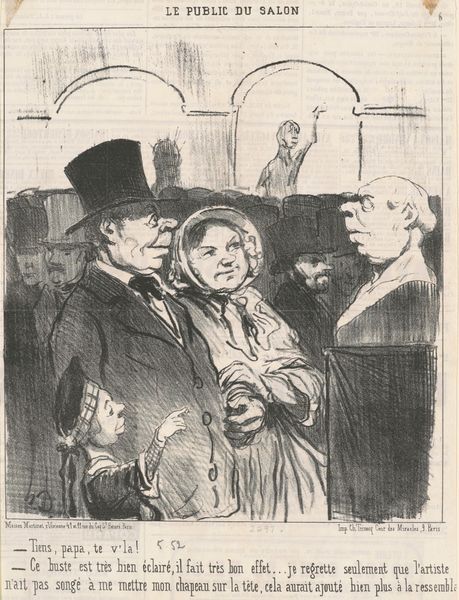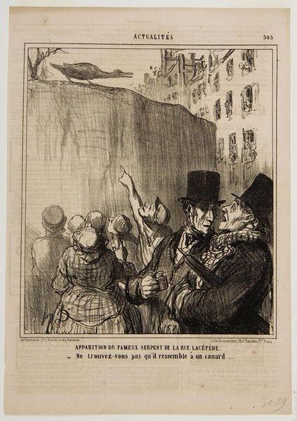 Editor: Here we have Honoré Daumier's lithograph, "Apparition du...serpent de la rue Lacépède," created around the 19th century. The scene depicts a crowd gazing upwards, seemingly in awe or perhaps alarm. What is particularly striking is the... contrast? What formal qualities do you find most compelling? Curator: Indeed. Consider how Daumier employs the lithographic medium to its fullest. Notice the hatching and cross-hatching. These are not merely descriptive; they actively construct the forms. The city’s background becomes angular planes – notice also the building to the left. What relationship do you observe between the crowd and their object of attention? Editor: They’re clearly transfixed, aren’t they? There's a real sense of motion created by all those upward gazes. They remind me of simple marks in musical composition -- but what about that snake-like object in the distance, rendered with relatively few lines? Curator: Precisely. Note how the linear quality isolates this supposed "serpent" and flattens that section of the composition against the buildings to its right. Can you describe the texture created by the lithographic crayon in rendering the clothing of the foreground figures? Editor: It's quite dense and layered, almost overwhelming. I hadn’t considered the deliberate choice of density before – but why draw so much attention to the surface? Curator: The layering invites a consideration of artifice; are we witnessing authentic reportage or social critique, rendered skillfully visible for us through layers of formal artistry? Editor: So, Daumier uses formal choices to suggest broader meanings within this… caricature? I see how looking closely reveals a depth I hadn't noticed. Thank you! Curator: The pleasure is mine. Remember, form is not mere decoration; it shapes meaning and guides interpretation.