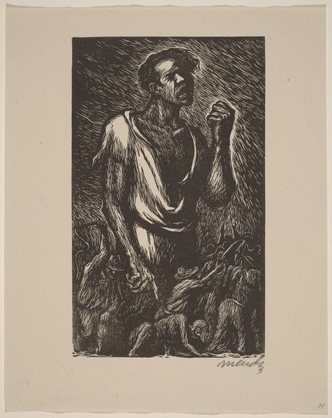 This image of a soldier of the Abraham Lincoln Brigade was made by Michael Lenson, and the date of its making is unknown. It's a print, and the mark-making is striking – almost brutal – in its directness. You can see the artist working and thinking through the process. There's a real physicality to this piece. Look at how the lines create a kind of density, especially around the figure's arms and the burning buildings in the background. The stark contrast between light and shadow adds to the emotional weight, evoking a sense of turmoil and resilience. Notice the soldier's face. The artist has used hatching and cross-hatching to give the skin texture and depth, really digging into the surface to bring this figure to life. The directness of Lenson’s mark-making reminds me of Käthe Kollwitz, whose unflinching depictions of war and social injustice share a similar emotional intensity. Ultimately, this piece is a powerful reminder that art is an ongoing dialogue, a conversation across time and cultures, and that meaning is always open to interpretation.