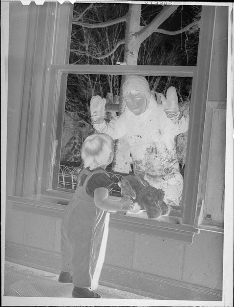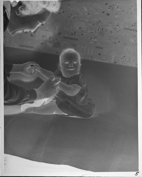 Editor: This photograph, Untitled (little boy and dog) by Lucian and Mary Brown, presents an inverted image, almost like a film negative. What strikes me is the apparent contrast between the opulence of the background wallpaper and what I perceive as a more modest presentation of the boy and his dog. What stands out to you in this piece? Curator: The inverted tonality reveals the photographic process itself, and highlights the labor involved in producing an image. The choice to present it this way also disrupts traditional consumption of the image. What does this say about value and the means of image production? Editor: That’s a great point. So, it’s about making us think about the photograph as a manufactured object? Curator: Exactly. It challenges the idea of a photograph as merely a window onto reality, and instead foregrounds the choices made in its creation and dissemination. Editor: I hadn't considered the process itself as part of the artistic statement. Thanks for sharing your perspective!