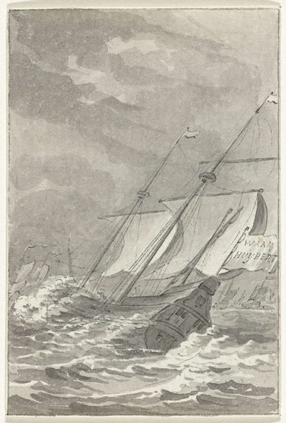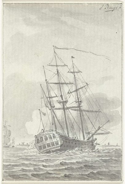 Curator: This is a pen and ink drawing entitled 'In 't Jaar 1784', created by an anonymous artist around 1789 to 1810, now held at the Rijksmuseum. The seascape scene captures the movement of a fully rigged ship. Editor: What immediately strikes me is the dynamism, that sense of implied action. The vessel cuts a path through choppy waters; smoke billows from the structure to the left—it seems to hum with potent tension. Curator: Indeed, the stark contrast of light and shadow amplifies that feeling. The choice of pen and ink is fascinating. Its monochrome allows us to focus on the texture, the way the light reflects off the water, and the sharp lines that give the ship its structure. The labour of creating this level of detail must have been immense. Editor: I agree. Observe how the artist utilizes cross-hatching to build form and depth. The masts are slender vertical lines intersected by a web of rigging; it all builds a complex geometry. And notice that flag with its bold, iconic imagery rippling against the sky! Curator: Which undoubtedly speaks to a specific time and political ideology! But more broadly, consider the consumption of maritime imagery at this time. Pictures like this would have circulated widely, celebrating Dutch maritime power and subtly shaping public perceptions of trade, conflict, and national identity. Who were the printmakers, distributors and consumers of images like this and how did their social contexts influence production and reception of this work? Editor: It is indeed rich in historical context! What appears a genre-painting, contains also a clear statement about compositional balance, the strategic placement of that smoking gun. The eye dances between the architectural solidity on the left and the freedom suggested by the ship's open course on the right. Curator: Right. And who is missing? We might not see them, but where are the enslaved peoples that undoubtedly worked the colonial industries this ship profited from? To see that labour, which is so vital to understanding art history, it would require re-thinking some of our perspectives. Editor: So, beyond aesthetics, we're urged to consider the economic and social framework—the unseen workforce that propelled such visual testaments to maritime achievement. Thank you, Curator. Curator: And thank you for prompting an invigorating reflection through the composition.