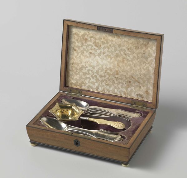 This is an invention horn, or orchestral horn, by Carl Gottlob Schüster, whose dates are unknown. The composition is dominated by the contrast between the rigid geometry of the wooden box and the fluid curves of the brass horn. The box, with its sharp edges and visible joinery, imposes a sense of order, while the horn's coiled tubing and flared bell introduce an element of unpredictable movement. This visual tension mirrors a fundamental aspect of musical creation: the balance between structure and improvisation. The patina of both the wood and brass suggests age and use, inviting us to consider the history embedded within these materials. Does the choice of materials reflect a specific historical context? Do they suggest a cultural preference? Ultimately, this work challenges us to see beyond the object itself and to recognize it as a signifier of broader cultural and philosophical meanings.