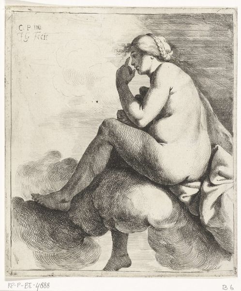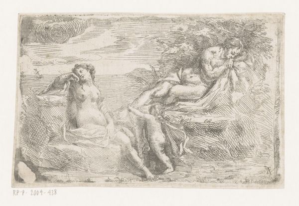 Editor: This intaglio print, "Vrouw met kind zit bij klassiek gebouw," or "Woman with Child Sitting by a Classical Building," created by Marcello Fogolino between 1529 and 1533, is quite striking. I’m drawn to the sharp contrast between the smooth, rounded forms of the figures and the angular architecture in the background. What can you tell me about how its composition contributes to the overall effect? Curator: Certainly. Observe how Fogolino uses line to delineate form, particularly in the musculature of the nude figure and the folds of the drapery. Note the subtle gradations of tone achieved through hatching and cross-hatching. These techniques generate both volume and texture, lending the work a tactile quality. Ask yourself how the solidity of the classical building might play against the organic quality of the nude form, or if the composition follows any known tropes of the period. Editor: The hatching and cross-hatching you pointed out definitely adds to the depth. It’s almost like a sculptural quality achieved on a flat surface. Is the implied contrast between the building and the figures something you think was deliberate? Curator: Undeniably. By positioning the figures in front of this imposing, man-made structure, Fogolino establishes a visual dialogue. This might encourage questions about humanity's place within a world shaped by classical ideals and monumental forms. The hard edges and sharp lines of the architecture, juxtaposed with the soft curves of the figures, introduce a productive tension into the work. What would you say the artist may have been expressing with those compositional decisions? Editor: That’s a compelling perspective. Considering the architecture alongside the figures truly changes the way I understand the image. Thanks! Curator: Indeed, analyzing the formal elements reveals the complexity of artistic intentions, prompting us to engage more deeply with the image.