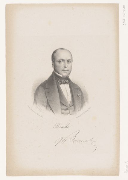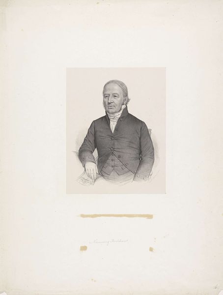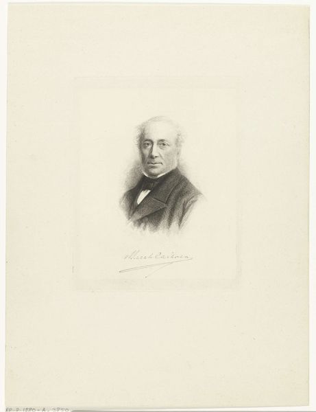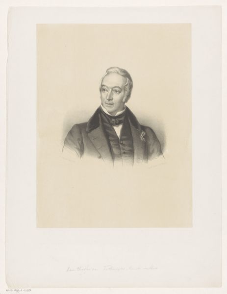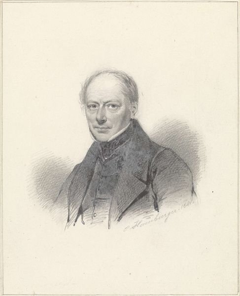 Editor: So, this is "Portret van A.C.G. Vermeulen" made in 1855 by Adrianus Johannes Ehnle. It’s a pencil drawing. What strikes me most is the sitter's rather stern expression. What do you see in this piece, especially beyond the surface representation? Curator: The stark realism indeed captures a certain... gravity. Beyond the man himself, I see a carefully constructed visual statement reflecting 19th-century ideals of masculinity and status. Note the subtle, almost imperceptible details. What kind of visual weight do you believe the button carries, there on his lapel? Editor: Hmm, I hadn’t considered the button specifically. It could suggest military or civic service. Are you saying it is included as a symbol rather than merely an element of dress? Curator: Precisely. Consider its placement—close to the heart. Ehnle subtly weaves societal expectations into the very fabric of this man's identity. The meticulous detail in rendering his face—each wrinkle, each line—speaks to the era's emphasis on character etched by experience. And consider the absence of color. What emotional resonance do you find in this monochromatic depiction? Editor: The lack of color definitely adds to the somber mood, highlighting the seriousness and perhaps suggesting a certain reserve. Curator: It echoes the prevailing social values, a deliberate choice contributing to the symbolic weight of the image. These portraits often served not just as likenesses but as carefully constructed representations of societal roles. Editor: I see. So, reading this portrait isn't just about recognizing the man but deciphering the cultural language encoded within. I will have to think more about symbolism. Curator: And reflecting upon the ongoing role of portraiture itself. It's far more complex than capturing a likeness. Thanks, I've learned new avenues of study with you today.