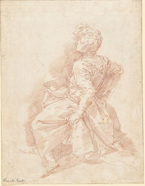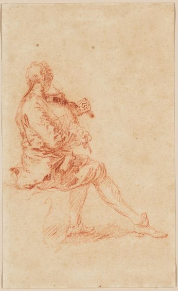 Jean-Antoine Watteau made this drawing of a seated guitarist with red chalk, a material beloved for its ability to capture the nuances of light and shadow. Red chalk is a naturally occurring pigment, mined and then prepared into sticks for drawing. Watteau expertly used this medium to create soft, delicate lines that define the figure’s pose and clothing, capturing the sitter’s relaxed, informal nature. Chalk allowed him to achieve subtle gradations in tone, which give the figure volume and depth. Watteau's choice of red chalk reflects a broader artistic trend of the time, moving away from the more formal and academic drawing styles towards a looser, more expressive approach. The ease with which chalk can be blended and manipulated allowed artists to experiment with new techniques and effects, resulting in a greater sense of immediacy and spontaneity in their work. This drawing reminds us that understanding the materials and making of art can reveal so much about its meaning and cultural significance.