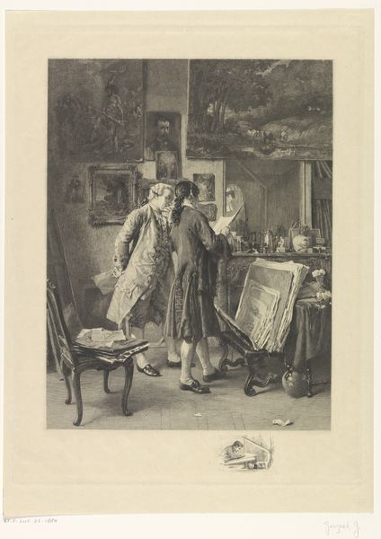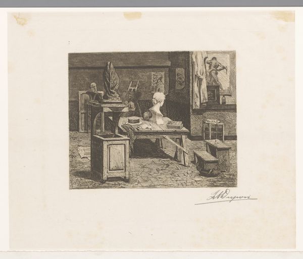 Editor: This etching by Edouard Tyck, from 1892, titled "Sculptor in his Workshop" shows the interior of an artist’s studio filled with various sculptures. It almost feels like peeking into a very personal, creative space. What aspects of its composition stand out to you? Curator: The density of line, and the almost claustrophobic arrangement of objects and figures in the space is quite compelling. Observe how Tyck utilizes the etching technique itself – the cross-hatching, the varied line weights – to create a sense of depth, but also of visual complexity. How does the overall tonal range strike you? Editor: It's predominantly dark, making it feel quite intimate and enclosed, and makes me focus on the figure of the sculptor and his immediate surroundings. It really creates a sense of focused labor, don't you think? Curator: Indeed. Note also how the artist utilizes light not realistically, but expressively, directing the gaze towards the seated figure he sculpts, creating a focal point within the intricate network of lines and forms. What is the function of the array of statuettes and masks on the shelves in relation to the central figure and his process? Editor: They act almost like a frame, emphasizing the artistic heritage and inspiration surrounding him. They serve as tangible representations of ideas he is surrounded by, that feed into his creativity. Is there any intention beyond merely framing the artisan? Curator: Consider their arrangement - their differing sizes and styles. Tyck may be invoking a certain visual tension between these elements to enhance the sense of artistic striving. The various textures, created solely by line, give the image its overall richness and complexity. It offers the viewer a multi-layered visual field to decode and navigate. Editor: It is amazing how much detail and depth Tyck achieved simply using lines! Thanks so much for that illuminating formal analysis. Curator: My pleasure. It is through precisely such close looking that the richness of visual language becomes apparent.