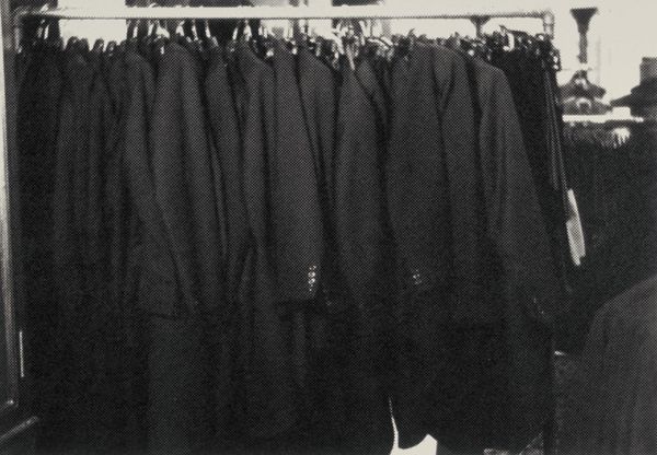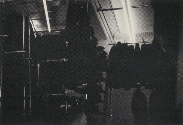 Curator: This intriguing image, by Paul Coldwell, part of the Tate Collections, presents us with rows of clothing racks. It’s an image that speaks to the sheer volume of production in the garment industry. Editor: It feels claustrophobic, almost haunting. The repetitive hanging garments evoke a sense of facelessness and uniformity. Curator: Exactly. The racks themselves suggest a system, a process. Coldwell highlights not just the finished product, but the infrastructure, the means through which clothing becomes so readily available. Editor: It also makes me think about what’s missing – the people who made them, the people who will wear them. All that unseen labor and future lives, condensed into these grey rows. Curator: So, in a sense, Coldwell uses the visual language of mass production to hint at the human stories behind the clothes we consume daily. Editor: Leaving us to ponder on the weight of those untold stories. A somber, but powerful reflection.