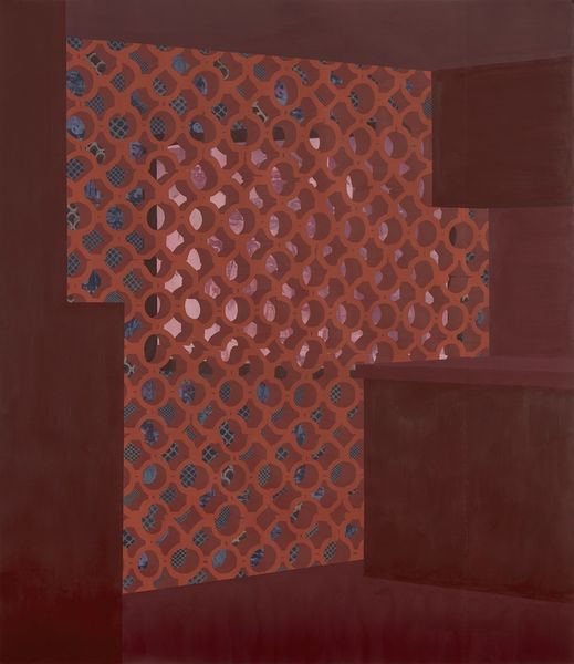 Editor: This is Clarence Holbrook Carter's "Arches," created in 1979. It looks like a painting and gives off a real sense of geometric order. I’m intrigued by how the bright red patterned floor leads to the softer blues and grays of the arches. What do you see in this piece? Curator: Structurally, the work is dominated by the receding plane of the tiled floor, a grid subverted by perspectival diminution, contrasted sharply with the static, planar nature of the arches themselves. The chromatic intensity of the floor tiles demands consideration. Editor: What is the artist trying to get across through that color and form? Curator: Note how the repetition of the arch form is subtly offset. The play between these ordered repetitions and the optical illusion of the floor creates a visual tension. One might ponder what symbolic weight to ascribe to the arch, traditionally a motif of triumph or passage. Here, its flatness renders such interpretations problematic, does it not? Editor: I see what you mean about the arches seeming more flat than grand. Is it fair to see the tile floor as another symbol? Curator: Perhaps it signifies confinement or an ordered space leading to an ambiguous beyond. We see a calculated flattening of pictorial space—akin to elements in hard-edge painting. It compels a focus on the pure relationship of color and form rather than narrative depth. Editor: Thanks for sharing. I am understanding how a visual piece such as "Arches" can invite the viewer to appreciate the artistic intention without delving into conventional symbolism. Curator: Precisely. It's through understanding of structure and form that meaning emerges.