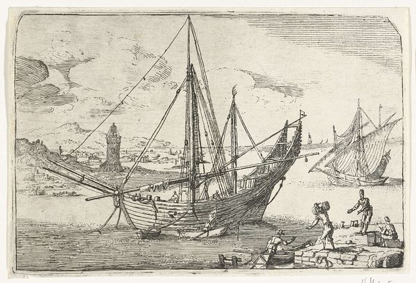 Editor: This etching, "Aanmeren van de postboot," or "Landing of the Mail Boat," made by Joost van Geel after 1666, presents a Dutch Golden Age seascape. There’s such intricate detail for a print! I’m curious about what role these boats played back then. How would you interpret the significance of this scene in its historical context? Curator: This print speaks volumes about the importance of maritime activity in the Dutch Republic's Golden Age. We see not just boats, but a vital artery of communication and commerce. Consider how these post boats connected communities, facilitated trade, and spread information. Can you see any visual cues about who might have had the access to this system of exchange? Editor: Well, the people on the larger boat seem well-to-do. Maybe merchants or government officials? It seems like this scene documents how essential these waterways were. The 'mail' suggests the rise of early institutions of communications that shaped the Republic's reputation. Curator: Precisely. The image underlines the central role of infrastructure for early global capital. Furthermore, reflect on who could afford to send or receive correspondence. This image then is a document of a network, accessible only to certain levels of society, influencing and controlled by mercantile elites. Editor: So the artwork functions as evidence of power dynamics at play within Dutch society? Curator: Precisely, it reveals how the control of communication and trade solidified certain power structures, a kind of visual archive of economic and social infrastructure that has shaped much of subsequent society. Editor: It’s fascinating to see how a simple scene like this holds so much social and historical information. I'll definitely look at these scenes with fresh eyes moving forward. Curator: And, hopefully, to further questions that may challenge any static narrative we may have.