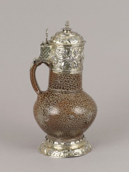 Curator: Look at this astonishing “Jug,” crafted sometime between 1575 and 1595. Currently held at the Metropolitan Museum of Art, this piece beautifully represents Mannerist decorative art. Editor: It’s visually arresting. The spotted stoneware contrasting with the ornate silver gives it a rather imposing yet elegant quality, doesn’t it? Like practical royalty. Curator: Indeed. The stoneware portion mimics a natural material, while the chased silver overlay suggests a sort of civilized containment, a powerful expression. This jug served more than a utilitarian purpose; it conveyed the owner's status and refined tastes. The lions allude to courage, dignity, and perhaps a connection to nobility, don't you think? Editor: Absolutely, but let's consider the artisan's labor involved. Creating such a textured surface on stoneware then intricately overlaying it with detailed silverwork speaks of significant time and a division of labor. How many different hands shaped this object, from mining the silver to firing the clay? Curator: An excellent point! We are gazing upon the result of considerable skilled work. Furthermore, the symbolism extends beyond simple heraldry; the decorative program likely contained complex meanings specific to the original owner, touching upon family history and aspirations. Editor: Right, these choices of pattern weren’t merely aesthetic, they are loaded. But understanding its intended market and use informs so much too: was it made for display or everyday ritual? This balance of raw material and lavish ornament screams early consumerism. Curator: Exactly. Ultimately, this jug represents a fusion of artistic and cultural values prevalent during the Renaissance, providing insight into the aspirations and beliefs of the elite class during that time. Editor: For me, considering its materiality pulls the image down to earth and acknowledges the human involvement with extracting the resources. Now that makes it precious to me.