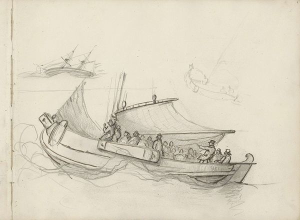 Editor: Here we have Pieter George Westenberg's pencil drawing, "Zeilschip op de zijde gezien, met op het schip twee mannen," likely created sometime between 1801 and 1873. There's a quiet, almost melancholic mood to it. The precision in rendering the boat is captivating. What aspects of this piece particularly resonate with you? Curator: Oh, the quiet drama of everyday life captured in simple lines! It reminds me of lazy summer afternoons by the canal. Westenberg, bless his observant heart, wasn't trying to paint some grand heroic scene. He’s whispering secrets about the lives of these ordinary folk, perhaps fishermen coming home after a long day. Notice how the light dances on the water—it’s more than just water; it's a reflection of their world. What do you make of the almost casual composition? Editor: I was struck by that, actually. It's not perfectly centered, which makes it feel very real. It feels more like a snapshot than a formal portrait of a ship. Curator: Exactly! It's as though Westenberg just happened upon this scene and quickly sketched it before the moment was gone. The slightly off-kilter perspective gives it a raw, immediate feel. What stories do you think these two figures on the boat are carrying? Editor: Hmm, now I'm picturing them swapping fish tales or maybe just enjoying the quiet company after a long day's work. I hadn't really considered their internal lives before. Curator: It’s amazing how a simple drawing can open up entire worlds. It’s a reminder that art isn’t just about grand statements. It's often found in the subtle moments we overlook. Thank you for helping me revisit and reconsider this small, quietly profound sketch. Editor: Thank you! This deeper perspective makes me appreciate how much storytelling can happen even in seemingly simple art.