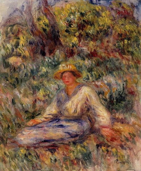 Pierre-Auguste Renoir made this oil painting, *Woman in a Landscape*, with rapid strokes of color building up the scene. The artist has applied thin layers of paint, creating a sense of light and movement. Look closely, and you'll notice how the brushwork is visible, adding texture and depth to the composition. Renoir used these qualities of the oil medium to enhance the viewer's experience, immersing them in the scene. Consider, too, that paint is itself a manufactured substance, made by industrial processes that were well-established in Renoir’s time. He had an unprecedented variety of colors to choose from. Impressionist painters like Renoir were among the first to really exploit this new availability, revolutionizing color in painting forever. So, next time you look at a painting, remember to think about the materials and processes that brought it to life; and how these connect to the wider world around us.
