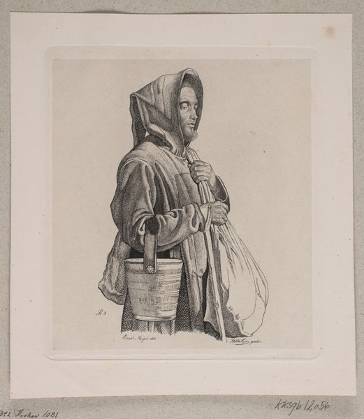 Editor: Here we have Vilhelm Kyhn’s "A Begging Monk", created as an etching in 1842. It’s a strikingly stark image, almost austere, wouldn’t you agree? What stands out to you? Curator: Indeed. Its austerity speaks volumes about its cultural moment. Genre paintings like this, particularly depictions of the poor and marginalized, became popular as a way to critique societal inequalities. Think of it in the context of 19th-century social reforms and rising nationalism; how do you think an image like this could contribute to such conversations? Editor: Well, showing a monk in poverty might challenge the church's power and wealth. It creates a human connection that invites empathy, maybe even action. Curator: Precisely! And notice how the etching technique – the precise lines and stark contrasts – lends itself to a certain realism, aiming for authenticity. But, crucially, whose ‘authenticity’ is being represented? Kyhn, as a member of the educated elite, is framing this representation for a particular audience. The image functions as a window into a life, but it is also very much a mirror reflecting the values and biases of the society consuming it. What does this artwork reveal to you? Editor: I suppose I hadn't considered the artist’s role in shaping how poverty is viewed. It’s less a neutral observation and more of a statement, influenced by the art world. Curator: Exactly. Art is rarely, if ever, neutral. Considering the historical context lets us engage with not just the "what" but also the "why" and "for whom." Editor: This has broadened my understanding, shifting my focus from simply seeing the image to thinking about the artist's choices and societal implications. Curator: It's a powerful reminder that art is a product of its time, shaped by, and in turn shaping, the world around it.