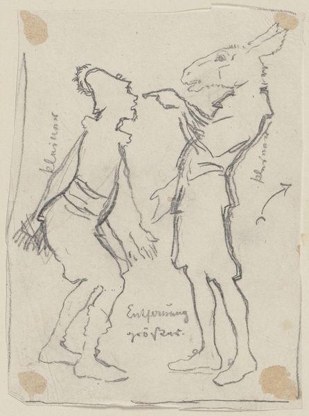 Curator: At first glance, this pencil drawing by Gustave Joseph Chéret exudes a sense of childlike innocence. Editor: There's a tenderness in the graphite work itself—very soft and preliminary, like a memory recalled gently. The composition feels rather informal; the two children are not quite centered, but huddled on the right, lending a sense of unstudied authenticity to their pose. Curator: This piece, known as "Two Children with a Doll," and created around 1870 to 1894, represents an intimate snapshot into the lives of children during that era. Chéret, famed for his Belle Époque posters, also captured such glimpses into private domestic moments. Editor: Note how Chéret only lightly implies volume and form. The facial features are rendered minimally, and yet that simple shift in line captures so much character. See the suggestion of weight in how the children’s bodies press into one another? The subtle cross-hatching gives form to their rudimentary clothes. It’s all quite charmingly effective. Curator: Indeed. Consider that Chéret, while celebrating modernity and the urban spectacle, occasionally returned to the intimate, quiet settings within bourgeois life. Perhaps this drawing serves as a reflection on childhood and innocence, somewhat contrasting to the consumer-driven world depicted in his poster work. Editor: I find the doll held by the child on the left fascinating. Its form is almost purely symbolic; it seems like no more than two quick marks. The lack of detailed visual representation grants the viewer an access point for speculation, encouraging us to consider the importance of imagination during play. Curator: Certainly. It reminds us of the evolving definitions of childhood that came into public and artistic discourse during the 19th century, and it underscores art’s capacity for preserving what industrial modernity might overshadow. Editor: Reflecting upon the quick, ethereal marks, it underscores Chéret's skill at harnessing the emotionality inherent to raw pencil lines. This approach contrasts strikingly with his later color lithography practice. Curator: Looking at it through today's context, this drawing stands out because it urges contemplation on children's pastimes, encouraging discussions on shifting historical perspectives. Editor: Indeed. In retrospect, the visual sparseness gives a window into both an artist's process, and the fleeting magic that underscores childhood.