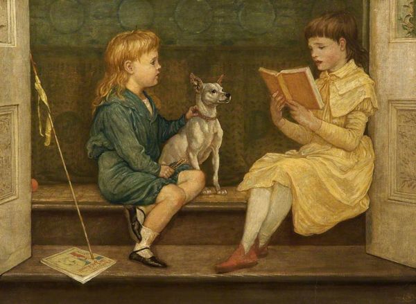 Editor: Here we have John George Brown’s “A Confab,” painted between 1902 and 1903. It’s an oil painting showing a boy and a dog seemingly in conversation. I’m struck by how intimate the moment feels. What do you see in this piece? Curator: I see a fascinating commentary on societal values embedded within what appears to be a simple genre scene. Consider the title, “A Confab,” suggesting an important discussion. Brown was known for depicting the lives of working-class children, often romanticizing them, and the sentimental focus served a distinct purpose. Editor: How so? Curator: By presenting an idealized view, Brown perhaps sought to elicit sympathy and support for these children, influencing public perception. Also, it’s relevant to note that at the time, organizations like the Children's Aid Society were actively involved in child welfare. How might a painting like this have played into their narratives? Editor: That’s a perspective I hadn't considered. It goes beyond just the surface image, doesn’t it? The way it could influence sentiment and potentially policy changes around child welfare. I had been purely considering artistic skill, rather than considering the contemporary culture when the art was created. Curator: Precisely. The choice of subject matter, the emphasis on innocence, even the artistic style – all become part of a larger cultural dialogue. Editor: This changes how I look at genre paintings now. I appreciate the way context influences a painting's message, and vice versa, the art impacts socio-political views. Curator: Absolutely. Paying attention to social history offers powerful new ideas regarding a work. It transforms our interpretation.