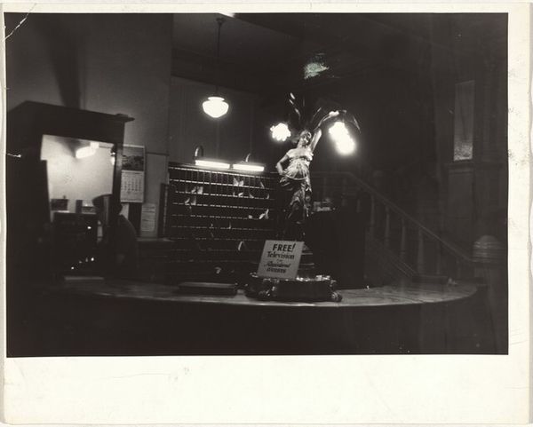 Editor: This is Robert Frank’s “Café at Night, Paris” from 1951. It's a black and white print photograph. It feels quite melancholic to me; the blurry figures inside and the empty tables give off a sense of loneliness. What can you tell me about it? Curator: It is interesting how you pinpointed that loneliness because, materially, it documents the shifting urban landscapes and post-war social fabric. It uses the gritty realism he’s known for. What sort of labor goes into making this sort of image, and who benefits from it? Editor: So, you are thinking about how Frank’s photography itself is a kind of work? And who is buying and displaying his work and for what purpose? Curator: Precisely. Consider the process: Frank likely wandered through the city, observing. Think about the socio-economic dynamics at play – who has the time and resources for leisure in such spaces, and whose labor sustains them? The printing process too--the darkroom work is where this really becomes 'art'. Editor: The café patrons, if they are well-off, are perhaps able to ignore the work done by those who are less fortunate to maintain that lifestyle? Curator: Exactly. Also, consider the disposable nature of photographic prints, especially in that era. How does its reproducibility affect its value as art versus a mere document of social realities? Editor: I never considered how the medium itself can be so revealing of social structures. It’s not just the subject of the photo. Curator: Yes, examining the labor of creating, distributing, and consuming the image gives it even more dimensions, right? Editor: It completely does. I'm walking away from this with a much deeper appreciation for understanding art. Curator: I agree. Focusing on the materials and methods makes it clear just how tied to larger economic structures an artist and artwork really are.