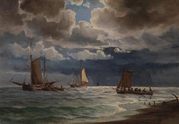 Johan Christian Dahl captured this scene of Boats on the Beach Near Naples with oil on canvas. The somber atmosphere is set by the grey, muted tones that dominate the canvas, punctuated by the vertical masts of the boats and the erupting volcano in the distance. Dahl masterfully uses line and form to draw our eyes to the visual dichotomy of man and nature. The boats, rendered with careful detail, are juxtaposed against the erupting Mount Vesuvius, whose peak is shrouded in smoke. This contrast isn’t just a visual trick; it's a deeper commentary on the sublime—the awe-inspiring yet terrifying power of nature. The painting's composition invites a semiotic reading, with the boats acting as signs of human presence against the overpowering signifier of the volcano. The entire scene reflects a Romantic sensibility, where nature is not just scenery but a force that shapes human existence. Dahl challenges us to consider our place within a world where stability is constantly threatened by change.
