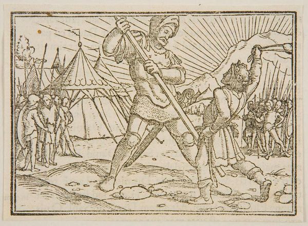 Editor: This is Hans Holbein the Younger's "David Kills Goliath," located at the Harvard Art Museums. The starkness of the black ink creates a really dramatic scene. What formal elements stand out to you in this piece? Curator: Note the stark contrast and decisive lines. The composition focuses on the dynamic opposition between the two figures. How does the artist use line to define form and action? Editor: The parallel lines create shading, and the repeated spears create depth. Is it just about the lines themselves, or is there more to it? Curator: The lines define not just form but also the very texture of the figures' clothing and armor, and how the linear perspective receding into the background creates a stage for the foreground action. Consider Holbein's choices, emphasizing the graphic impact of the woodcut. Editor: I see it now; it’s not just the story, but how the story is told visually that matters most. Curator: Precisely, we've only scratched the surface, but hopefully, it encourages more rigorous analysis.