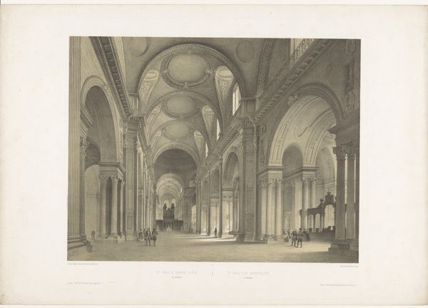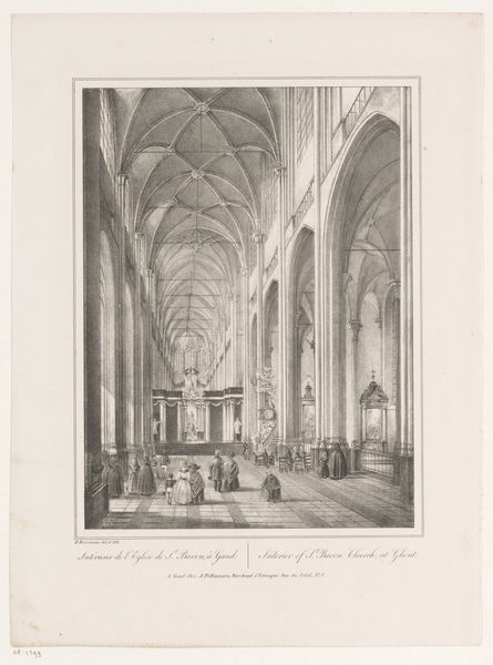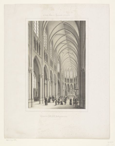 Curator: Adolphe Jean Baptiste Bayot created this artwork entitled, “Interior of the Saint-Maurice Cathedral in Vienne” between 1843 and 1848. Editor: What immediately strikes me is the stark contrast of light and shadow; it evokes a distinct sense of the sublime, that kind of overwhelming awe one feels in vast spaces. The precision in the linear perspective also seems paramount here. Curator: Absolutely, the use of perspective places the viewer within the sacred space but let's not overlook the people in this rendering. Bayot’s choice to depict a gathering, mostly of women it seems, shifts our focus to think about gender roles within the religious space, no? Editor: Yes, there is an assembly of figures, they add a touch of humanity, don't they? But focusing strictly on composition, look at how Bayot employs those Gothic arches. See how they create these incredible frames within frames, each guiding your eye deeper into the sanctuary. It's all about spatial organization. Curator: Well, thinking of this from a gender perspective, Gothic architecture historically enforced separations and hierarchies. Those frames direct the gaze of male clerics as they perform in designated locations, while women were relegated to a peripheral audience, so the artwork makes me think of surveillance within patriarchy. Editor: Very interesting point, that. But stepping back, considering materiality, it's a drawing and print, an engraving specifically. It uses this incredible cross-hatching technique, which generates a fantastic texture; the very appearance of light dancing on stone is, frankly, quite astonishing. Curator: Of course! And perhaps this very dissemination is central: Bayot captured the visual experience of the Church. It offers insights into the social lives of these worshippers within a quickly industrializing France; we glimpse these women who lived long before secular culture redefined faith and ritual for us. Editor: Indeed. Thinking it over now, what strikes me is the sheer technical skill with which Bayot represents that sense of immense scale, of a receding perspective. I’ll admit, though, the social dimension adds another rich layer to this image that I didn't fully consider at first glance. Curator: And I am drawn to those gothic elements we see throughout the composition that remind me that these locations and practices are culturally embedded in our societal consciousnesses.