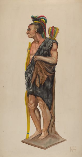 Curator: At first glance, this watercolour and charcoal drawing of a carved figurehead feels somewhat...heroic, maybe even defiant, gazing upwards like that. Editor: We’re looking at a piece entitled "Figurehead: Indian," dating from 1935 to 1942, made from wood. It’s a representation of, ostensibly, an Indigenous person used as a decorative element, probably on the bow of a ship. This makes the method of carving central to its making, not so? What toolmarks remain? How was it affixed, or situated onboard? Curator: Precisely, because while on its own it appears as a portrait, the object's original placement reveals a network of manufacturing that implicates both skilled labor and the market value of decorative woodwork. Editor: And consider the symbolic weight it carried on a ship – both literally, acting as ballast and figuratively as a representation of a specific population during an era deeply entangled with colonialism and, here in America, federal Indian policy. Curator: What's also striking to me is the translation of wood carving, a highly tactile craft, into these much more visually immediate media. What kind of labor practices supported that move? Does that flatten its reception? Editor: I see your point. It also becomes detached from any direct association with Indigenous creation itself, further reinforcing its place within a specific power structure rather than honoring or accurately reflecting any authentic cultural representation. Museums especially bear this challenge when exhibiting an artwork originally intended as spectacle in a politicized, marine setting. Curator: Agreed. Understanding the whole journey here–from its possible manufacture to its place as cultural artifact allows us a better grasp on the forces that influenced its production, beyond just aesthetics. Editor: Indeed, seeing the art's intersection within political history requires critical insight, to recognize its implications even past its initial use on ship—as artwork today—by asking whose voices it reflects, whose labor it celebrates, and, just as important, whose histories remain submerged. Curator: This approach to the artwork truly helps highlight not just artistic skill, but the historical weight imbued in everyday, seemingly innocuous objects, making our perception more informed overall. Editor: A richer narrative for the viewer to embrace, to critically unpack.