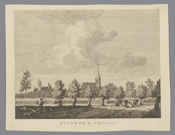 Curator: This is "View of Franeker, Seen from Schalsum", an engraving created around 1779-1805 and now residing in the Rijksmuseum. What strikes you about it initially? Editor: Well, it’s like stepping back in time. There’s a peacefulness... a quiet pastoral feel despite it being a cityscape. And the cows! Always with the cows, right? Curator: Indeed. This print exemplifies Dutch Golden Age landscape and cityscape traditions. Consider the printmaking process itself – the artist, Dirk de Jong, painstakingly incised lines into a metal plate, translating a scene into reproducible form. Think of the labor involved in that kind of distribution of imagery. Editor: It makes you appreciate the detail so much more. I mean, look at the clouds, the way they’re built up from tiny lines. It’s so meticulous. It almost feels devotional in a way – honoring the landscape by documenting it with such care. Curator: The act of engraving itself elevated the everyday, transforming a view into a commodity. Consider the role prints played in disseminating knowledge, constructing national identity, and shaping consumer culture at the time. This print normalizes rural economies for wider consumption, emphasizing the connection to agricultural resources, perhaps intended for a city-dwelling patron. Editor: That makes perfect sense. It is kind of idealized, isn't it? A snapshot of simple country life, nicely packaged. But also, I can almost feel the weight of the clouds and the dampness of the fields. I love how the artist gave equal importance to the scenery than the town itself in the background, don’t you think? Curator: Landscape depictions are never neutral. Even the animals present a sense of curated idyll, contributing to the larger social and economic narratives being constructed through the image. It’s about ownership, production and land value. Editor: Okay, that's true! Thanks, that context changes how I view this. It’s still beautiful, though. Makes me think about how we frame "nature" even now, what we choose to see, and what we leave out. Curator: Exactly, seeing what is not obviously present is important when thinking about production of the artwork. Editor: Well, now I see a landscape designed, carefully, and very purposefully distributed as more than just a view.