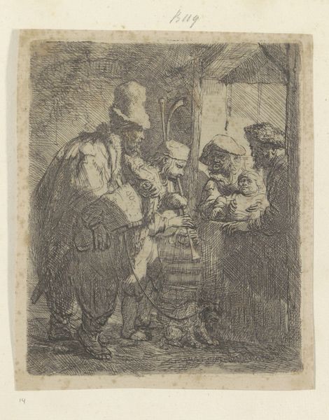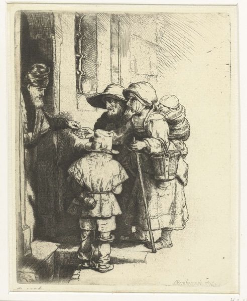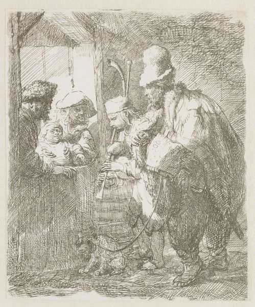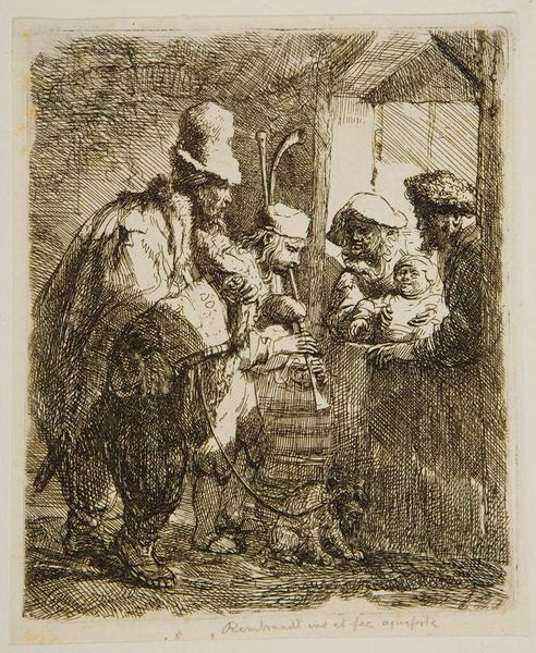 Rembrandt van Rijn created "The Strolling Musicians" using etching techniques, capturing a scene that offers a glimpse into the everyday life and social dynamics of 17th-century Netherlands. Rembrandt, deeply embedded in the cultural milieu of the Dutch Golden Age, presents us with a band of itinerant musicians serenading a family, perhaps for a meager compensation. What strikes me most here is the stark contrast between the performers and their audience. The musicians, rendered with heavy strokes and darker inks, appear weathered and worn, their clothing and instruments reflecting their itinerant lifestyle. Conversely, the family at the window is bathed in a soft light, their expressions conveying a sense of comfort and security. This interplay sheds light on class distinctions, revealing the dependence of the poor on the generosity of the more affluent. The figures and setting invite us to reflect on our own positions within the social hierarchy. It’s a poignant reminder of the uneven distribution of resources and opportunities that persists even today.