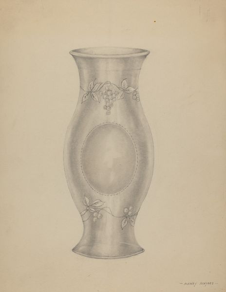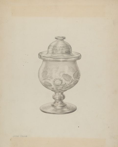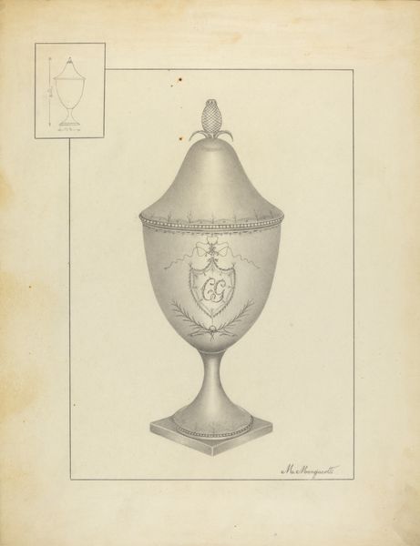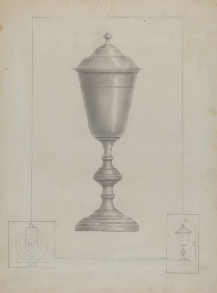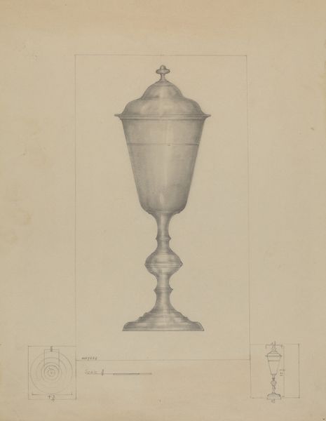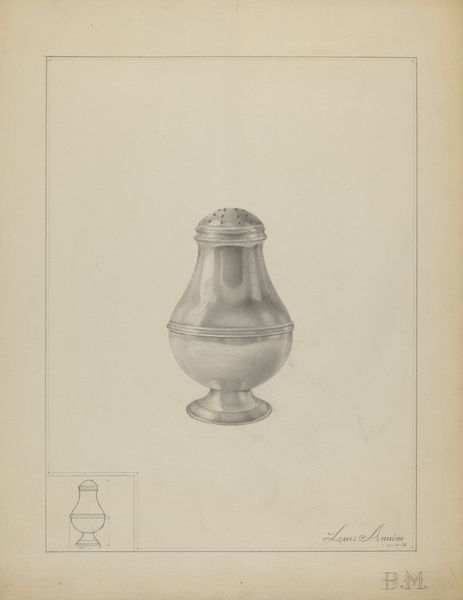Isidore Steinberg rendered this drawing of a silver sugar bowl using graphite on paper. The composition is dominated by the detailed depiction of the bowl, its metallic sheen meticulously captured through subtle gradations of graphite. The drawing is an exercise in form, presenting a study in volume and light. Consider the smaller, diagrammatic rendering of the sugar bowl in the lower-left corner. This addition provides an interesting structural counterpoint to the main image. The main rendering embodies the bowl as a sculptural form with its curving silhouette and reflective surface, while the smaller rendering serves almost as an architect’s plan or an engineer's elevation, reducing the object to its essential lines. Steinberg's drawing plays with different modes of representation, inviting us to see the object not just as an aesthetic presence but also as a construct—an interplay of lines, surfaces, and volumes defined by its material existence and symbolic function. Through this formal juxtaposition, the artwork engages with the viewer, challenging the perception of everyday objects.