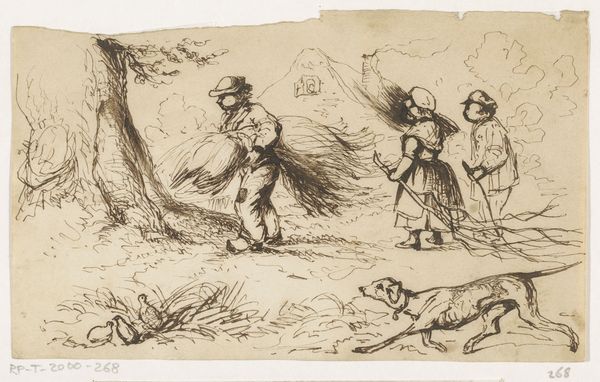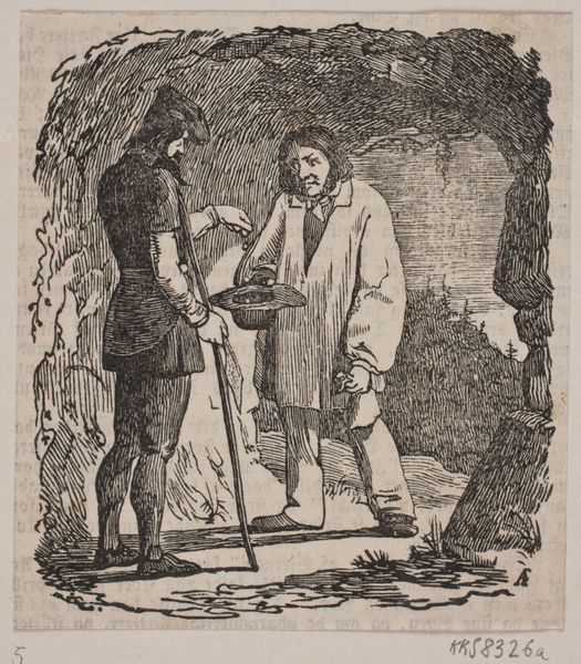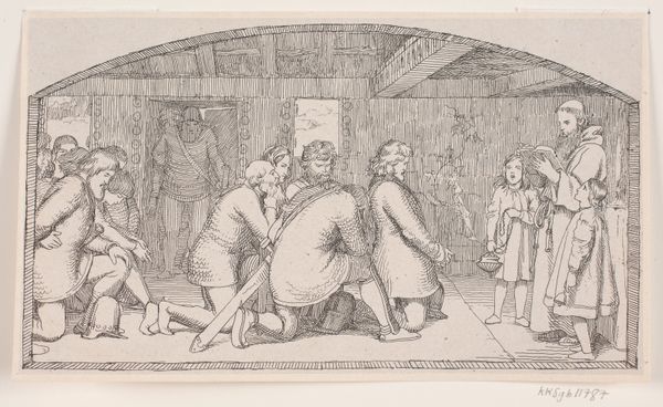Curator: Here we have an engraving by Martinus Rørbye, dating to 1834. It is an illustration for "Halvhundrede Fabler for Børn" or "Fifty Fables for Children" by Hey. Editor: Well, isn't this charmingly peculiar! A snowman with a rather severe expression confronts three boys who appear equally bewildered. The light is wonderfully soft, giving the whole scene an ethereal glow. Curator: Yes, Rørbye was a key figure in the Danish Golden Age and this is very representative of Romanticism, a blend of genre painting and narrative. It’s interesting how he uses such a precise, almost scientific engraving technique for a children's illustration. He likely sought to depict something from everyday life with the available materials in his reach. Editor: Precisely. You feel the weight of those tiny lines making up the form. The snowman, the makeshift materials, even the children's slightly stilted postures—they all contribute to this strangely haunting quality. Curator: The medium itself tells a story, right? An engraving would allow mass production and broader dissemination of these fables to reach the burgeoning middle class in 19th-century Denmark. It democratized access to both art and literature, serving an educational function beyond mere aesthetic pleasure. Editor: True. It almost feels as if we're catching a moment suspended in time, as if that very scene will soon disappear, ephemeral just as snow. You think they know that their creation won't survive, that even stories can be altered by their telling? Curator: Perhaps Rørbye is hinting at the transience of childhood itself. It’s intriguing to consider the labor involved: the physical act of carving, inverting the narrative from ephemeral to materially recorded through this medium, preserved by institutions like the SMK. Editor: Yes! You almost hear the faint scratch of the engraving tool meeting the metal. What lingers is a beautiful paradox – capturing ephemerality with incredible enduring artistic method. I keep wondering if these lads know their fleeting joy has been immortalized? Curator: Quite so. It gives new context to their frozen tableau of bewilderment doesn't it?