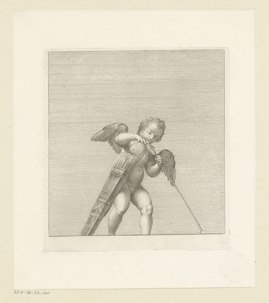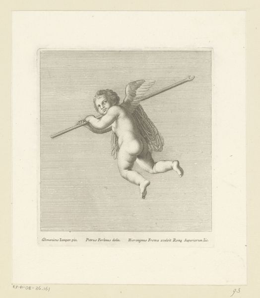 Curator: Looking at "Putto met speer en hoorn" from 1713, an engraving by Giovanni Girolamo Frezza. Editor: There's an immediacy to this, despite its age. The cherubic figure is almost startling in its liveliness, especially for an engraving. You can feel the breath forcing air into the horn, poised and ready for action. Curator: Well, it’s important to understand how engravings functioned in the 18th century. Frezza wasn't necessarily making "original" art. He was likely reproducing an existing painting or sculpture for wider distribution. Consider it a form of early mass media. The material of engraving also lends a very fine precision and clarity. Editor: I suppose I'm interested in the choices embedded within that reproductive process. The sharp contrasts of light and shadow. The emphasis on the putto's almost unsettling expression. It wasn't just mechanical reproduction. Someone, Frezza, had to actively decide how to translate the original. And what sociopolitical impact that could make for audiences, with religious symbolism playing a powerful role in the 18th century. Curator: I would wager he aimed to create something marketable. Prints like these circulated through networks of collectors, artists, and merchants. They demonstrate Baroque sensibilities. A lot of this trade of artistic representations shaped aesthetic tastes across social classes. This putto is presented for consumption. Editor: Interesting. We see this figure, seemingly caught in a moment of declaration or proclamation, and it's transformed by the labor involved in its creation. This changes how we perceive its role in its original sociopolitical framework, shifting from representation into a unique artistic statement about faith, class, and labor of its time. Curator: Perhaps. Regardless, Frezza's "Putto met speer en hoorn" is an intriguing demonstration of the production processes influencing art appreciation of the time. Editor: And for me, the reproduction speaks of much more beyond a specific artistic value and trade networks; how the meaning can change as labor and purpose recontextualize its significance within society and political systems.