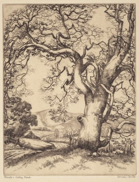 Editor: Here we have "Road to Quimper," a pen and ink drawing made in 1932 by Grace Albee. There's something quite stark about the high contrast, and I'm immediately drawn to the almost claustrophobic effect created by the trees framing what appears to be a small building in the distance. What compositional elements stand out to you in this piece? Curator: Immediately, I’m compelled to consider the foreground’s assertive texture and the calculated interplay between light and shadow. Albee meticulously crafted depth using a complex network of lines; the hatching and cross-hatching create a remarkable tonal range given the medium. Consider how the density of the linework informs the textural details of each trunk, for example. Editor: Yes, I can definitely see how she built up form with the lines. It gives the trees a very tangible, almost tactile presence. How does this contribute to the overall aesthetic? Curator: Precisely. This creates a powerful tension between the dense foreground and the more vaguely defined space beyond the trees. We find ourselves in a space where structure confronts the organic. The graphic rendering flattens perspectival recession and creates an active oscillation between surface and depth, underscoring the artwork as constructed object, a designed space. Editor: So you’re saying it’s less about accurately depicting a landscape and more about the artist’s manipulation of form and line to create a visual experience? Curator: Quite so. Albee is less concerned with mimetic representation than with exploiting the formal potential of the medium itself, the graphic properties, the tonal values produced by the act of inking a surface. How do you interpret the use of high contrast? Editor: I think the strong contrast heightens the sense of drama and emphasizes the geometric qualities of the trees and buildings. It's really about the balance and relationships between the different shapes. Curator: Indeed. Considering this exchange of foreground-background relations reveals the semiotic range. It underscores the inherent tension within a constructed reality. Editor: I never thought of it that way before. I see how analyzing the lines and forms reveal so much more than simply looking at it as a picture of a landscape. Thanks!