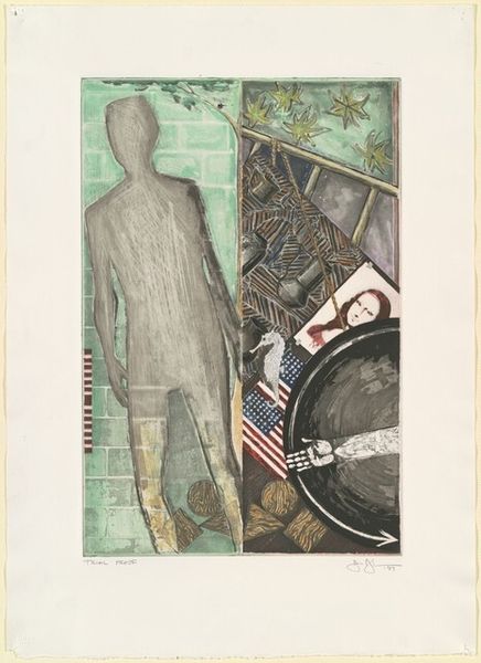 Editor: Here we have Jasper Johns' print, "The Seasons (Summer)". It is a mixed media print, I find the composition a little bit unsettling, like a fragmented dream. What do you make of it? Curator: Unsettling is a good word. It’s a deeply personal piece, wouldn't you say? The fragmented imagery--the mannequin, the American flag, the Mona Lisa-- feels like memories colliding. Do you notice how the artist's shadow is cast within the composition, almost like a ghost? Editor: I didn't see that at first! How does that relate to the season of summer? Curator: Summer is often associated with nostalgia, fleeting moments. Johns seems to be capturing the ephemeral nature of memory itself, the way fragments linger and fade. We're left with a sense of longing, a personal reflection on time. Editor: So, it's less about sunshine and beaches, and more about the internal landscape of summer? Thanks, that gives me a lot to think about. Curator: Exactly. Art is often about turning assumptions inside out. And who knows? Maybe the beach is in there somewhere, too.