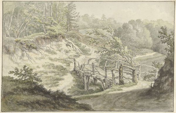 Georg Melchior Kraus made this watercolor titled 'Weg in einem Park, links ein Felsblock’ sometime in the late 18th century. Kraus was part of the Weimar Princely Free Drawing School, which was a hub of artistic activity at the time, and it's fascinating to consider the social context of this seemingly simple landscape. The work is made with watercolor on paper, a medium that allows for delicate washes of color and fine details. The texture of the paper itself becomes part of the image, adding to the overall sense of depth and atmosphere. The visible marks of the brushstrokes reflect the direct engagement between Kraus and the landscape, capturing a specific moment in time. It reminds us that the picturesque aesthetic was, in its own way, a kind of labor – transforming natural scenes into consumable images. By emphasizing the materials, making, and context of this watercolor, we recognize it as more than just a pretty picture, but a window into the social and cultural values of its time.