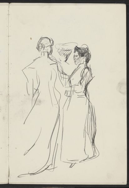 Curator: What a wonderfully unassuming piece. This drawing, executed in pencil on paper, is called "Abklatsch van de krijttekening op blad 21 recto," dating roughly between 1875 and 1934, by Isaac Israels. It resides here at the Rijksmuseum. Editor: Immediately I'm drawn in by the delicate and almost ghostly presence of these figures. There’s a quiet intimacy suggested by their sketched forms. A wisp of memory, perhaps? Curator: Yes, there is that ethereal quality, isn't there? Israels, an Impressionist, captured the fleeting moments of daily life. In its form and technique, we see Israels making an ‘abklatsch’, a copy from another page in a sketchbook. Perhaps a study, or just a quick impression taken from another work to develop at a later date. Editor: A sketchbook, ah that explains the spontaneous feel! It has the air of something jotted down in a cafe, stolen moments captured with incredible sensitivity. I wonder what they were talking about... Or is the more important part of their story in the silences? Curator: Silence is intrinsic to the symbolism. Sketches hold within them an incomplete language. Think of it like runes: Each line, seemingly simple, contains potential energy. The suggestion is just as important, if not more so, than definition. Look at the subtle nuances created simply by the varying weight of the pencil lines. Editor: Absolutely! The negative space becomes a palpable presence in this sketch. It defines them as much as the graphite does. It's the ghost of a thought, a feeling… a secret shared. A secret, incomplete, that you're left wanting to know more of. It hints to another deeper more elaborate completed piece. Curator: The impressionist period had an incredible interest in experimentation. In the sketch, we witness this intimate exploration with line, form, and ultimately, with feeling itself. Editor: Looking at this I feel inspired to dig out my own sketchbook and see what I might capture! These hints of figures spark my imagination. What a wonderful glimpse into an artist's mind and process.