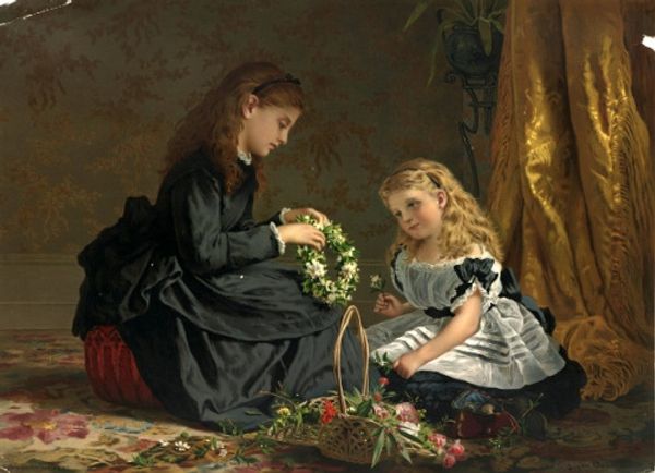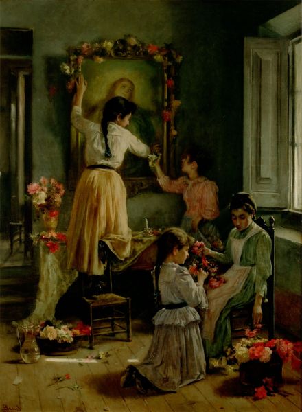 Joan Brull painted this scene of girls decorating an altar with flowers using oil on canvas. The artist’s choice of oil paint, a traditional medium, is interesting when considering the subject. We see children engaged in the handmade task of creating flower garlands, celebrating the Month of Mary. The delicate flowers, carefully woven together, stand in contrast to the more permanent medium of oil paint. Brull captures the ephemeral beauty of the flowers, preserving a moment of childhood innocence and devotion. The arrangement, a skilled tradition passed down through generations, connects the girls to a rich history of creative practices. Notice the contrast between the labor of the girls and the motherly figure in the background doing needlework, perhaps mending or making clothing. These daily and seasonal activities are given significance by Brull, who elevates the handmade and domestic sphere. Ultimately, Brull's "Month of Mary" reminds us of the value in everyday rituals, and the importance of recognizing skill wherever we find it.