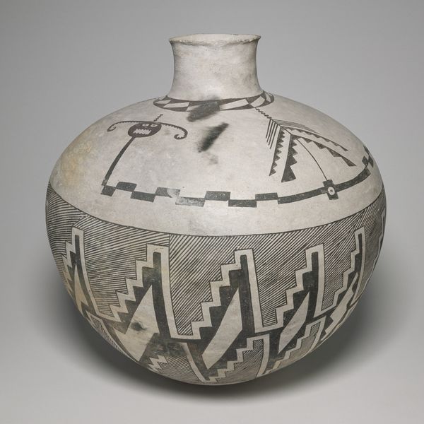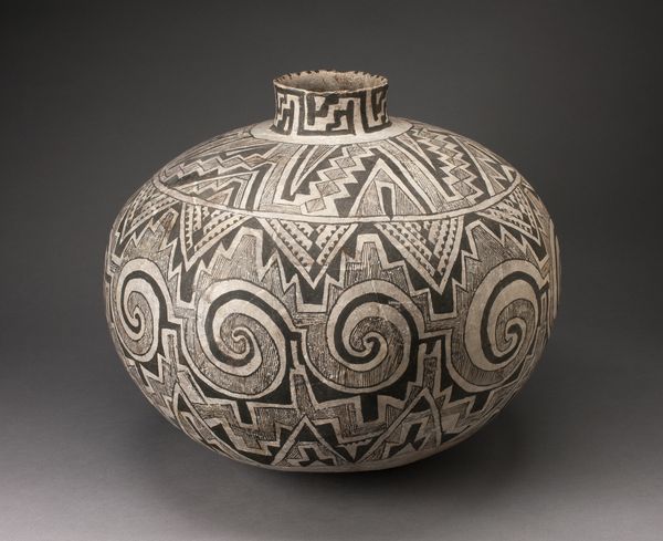 This storage jar, or olla, was crafted by the Ancestral Pueblo people, adorned with striking geometric patterns. Notice the prominent spirals, motifs of perpetual motion and life's cyclical journey, mirroring the ever-turning wheel of seasons, and the constant return to a central point, a form of continuous creation. Spirals are not unique to this culture. In ancient Greek art, the meander pattern, a linear spiral, symbolizes infinity and unity. Think of the labyrinth, a spiraling maze that holds the Minotaur, a powerful symbol of inner turmoil and discovery. The spiral, a universal symbol across time, evokes profound emotions of continuity and the search for meaning. Here, in this jar, the spirals create an emotional echo, connecting the Ancestral Pueblo's worldview to our own subconscious understanding of life’s rhythms. The spiral's resurgence throughout history underscores its power to resonate, adapt, and reflect humanity's shared experiences and collective memory.