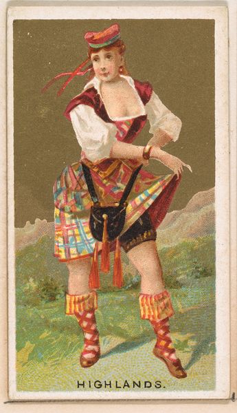 Editor: Here we have "Highland Fling" by Kinney Brothers Tobacco Company, dating back to 1889. It's a colorful print; the dancer seems to almost leap off of it. I'm curious—how do you interpret this work in terms of its historical and cultural references? Curator: What strikes me first is how this image serves as a memory trigger, almost a postcard from a romanticized past. The Highland Fling itself, beyond being a dance, is a potent symbol of Scottish identity. The kilt, the colors, even the specific pose – all evoke a constructed idea of "Scottishness" that was particularly powerful in the late 19th century. Notice how carefully each element is rendered, almost staged, feeding into a desire for authenticity and connection to roots, even if that connection is, in part, imagined. Does the dancer remind you of anything familiar? Editor: Hmm, you mean besides a shortbread tin? I guess, there's something… theatrical about him. Like he's on display. Curator: Exactly. Consider the context: a tobacco card. These were designed to be collected, traded, consumed. This image of the Highlander became a miniature ambassador, a visual shorthand for exoticism and tradition that could be held in your hand. So, in a way, he *is* on display – carefully packaged for a particular audience. It makes one wonder, doesn't it, what stories and meanings we assign to these images, and what purposes they ultimately serve? Editor: So it's less about historical accuracy and more about projecting a specific image? That's definitely something to think about. I’ll never look at a souvenir the same way again.