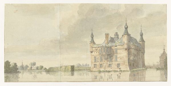 Curator: This work, titled "D'groote Hontpoont te Haarlem" by Hendrik de Winter, uses a combination of ink, watercolor and coloured pencil to capture a Dutch cityscape. What's your initial take? Editor: It has an ethereal quality, almost dreamlike. The delicate washes of color give it a muted atmosphere. The architecture appears to rise from the water, casting interesting reflections that soften the rigid lines of the buildings. Curator: Let's consider the production. De Winter was part of a generation that saw a shift in artistic training and the rise of academies. This watercolor, with its precise lines and carefully considered composition, suggests the disciplined approach they emphasized. We see architecture depicted through a delicate dance between structure and artistic license. Editor: True, and from a purely formal standpoint, notice how he balances the heavy architectural presence on the left with the lightness of the trees and open sky on the right. It creates visual harmony despite the differing masses. The subtle tonal gradations bring depth and shape to the facade of the building. Curator: Also think about Haarlem itself, a thriving economic center. Depictions of its structures serve not just as simple cityscapes, but also become symbols of civic pride and progress within a bustling, materialist society. These kinds of pieces, because they can be replicated and distributed relatively easily, serve the purpose of placemaking and placekeeping. Editor: Indeed, though I'm struck by the light—how it interacts with the surfaces. There is also that delicate reflected geometry of the bridge arches. De Winter orchestrates light and reflection, crafting an intricate visual puzzle, using only pale chromatic and luminous effects. The artist invites our eye into a spatial experience that feels both serene and structurally complete. Curator: Looking closely, the rendering of details - like the figures on the bridge - suggests the growing leisure class in the area at this time. It is an understated acknowledgement of how society shapes the production and appreciation of such works. The availability of materials certainly would have played a part as well. Editor: Fair points. The perspective is interesting too, drawing us towards the architecture, it accentuates that feeling of peaceful monumentality. Curator: Precisely. Ultimately, "D'groote Hontpoont te Haarlem" speaks volumes about the societal context of artistic production. Editor: And what a delightful exploration of line, form, and luminous subtlety.