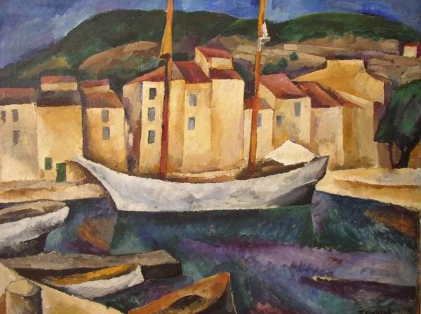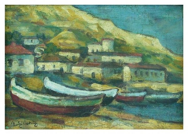 Curator: Soothing, wouldn't you say? The watercolor sings a song of rest. I can almost smell the salt air and feel the cool spray of the waves on my face. Editor: Calm, yes, but also meticulously crafted. Look at the placement of those fishing nets in the foreground; they anchor the composition, but also hint at the labor involved in producing this picturesque scene. Pyotr Konchalovsky painted "Balaklava. Fishing Nets" in 1929, offering a snapshot of daily life far removed from high art circles. Curator: And that life, captured with such delicate brushstrokes! The colors feel alive. The almost childlike simplicity of the houses clinging to the hillside lends a dreamlike quality. It's not just observation; it's felt. It pulls at something ancient in my soul. Editor: The visible brushwork isn’t just expressive; it highlights the very act of making. This watercolor technique, coupled with his interest in everyday scenes, dismantles the barrier between the fine arts and more accessible visual traditions. Think of the production process; what kind of paper, what sort of brush and pigments are being used and how available are they. Curator: All of which feed back into my sense that this is about more than a scene—it's a feeling of profound connection. Look at that water; how it shimmers and shifts, leading you in. There’s this balance that it manages: a place to dream that is also somewhere real. Editor: But whose reality are we seeing? The soft colors and simplified forms aestheticize the realities of the Balaklava fishing community. Those nets symbolize more than just quaint scenery; they're tools of survival, a source of livelihood shaped by social and economic forces that this image tends to overlook. Curator: Maybe it does... and maybe sometimes beauty itself can be a kind of truth, offering a space for contemplation and reminding us of our shared humanity. Isn't there also space for this sort of escapism? For a watercolor embrace? Editor: Perhaps. Though the challenge remains for us as viewers, how do we reconcile Konchalovsky's romantic vision with the complex realities of work and life behind this seemingly simple scene? Curator: True... the eternal dance: feeling and fact. Editor: Always. It's in navigating that space that art becomes more than just image.
