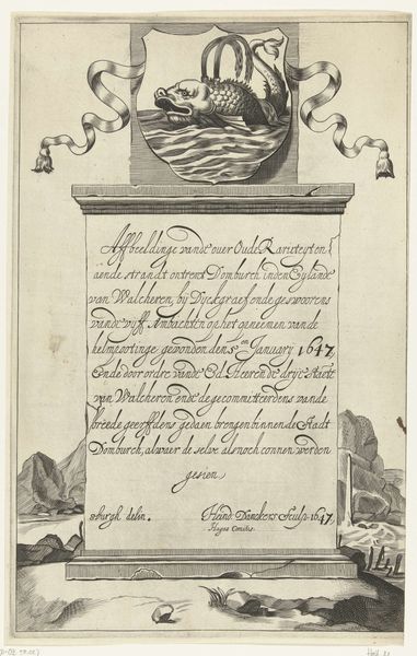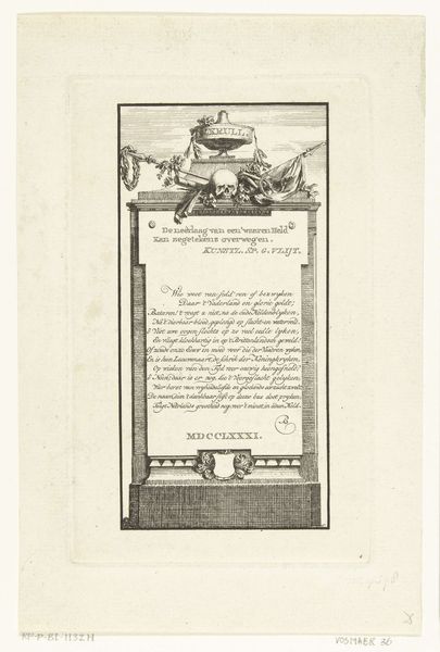 Editor: This engraving is a memorial for Captain Cornelis Jansz de Haen. The artist is anonymous, dating the work somewhere between 1633 and 1699. The material itself gives it a distant, historical feel. What do you make of it? Curator: It speaks of bravery, doesn't it? It almost feels like stumbling upon a forgotten poem etched in stone. The composition is fascinating – the upper text detailing the captain’s virtues, and below, that miniature seascape with ships locked in battle... it’s as if a grand, sweeping epic is being condensed into a very intimate space. It also has this curious combination of precision, typical of engravings, with a more baroque flair in the framing. Editor: The Latin text makes it feel very official and distanced. It is hard to decipher all the Latin but I can read just enough to have some idea about the scene represented in the print. Curator: Exactly! And look closer – at the bottom, there's this skull grinning back at us! These artists always gave us a dark, strange sense of humour to juxtapose against the bravado of the written test. All those meticulous lines forming a picture, a story, a man’s life and achievements immortalized—or is it his demise? In this engraving, the ships symbolize more than just maritime vessels and naval victories; they signify life, voyage, challenges. What stands out to you? Editor: The use of different languages does highlight this historical character more and bring awareness to his origins. It is like time-travelling and experiencing a fragment of history frozen within the artwork. Curator: Agreed! Each tiny line, each carefully placed detail, gives us more insight, reminding us that within every artwork, lies a piece of history wanting to be discovered.