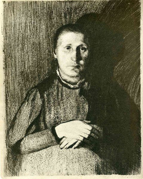 Editor: Here we have Robert Hatton Monks' "Portrait of a Young Woman." It's a striking drawing, though the lack of color gives it a somber feel. What do you see in this piece? Curator: This portrait, absent a precise date, becomes an interesting case study. How does the artist's choice of monochrome imagery affect its reception in a world increasingly saturated with color photography and mass media? Editor: So, the political implications of choosing to depict someone this way? Curator: Precisely. The lack of adornment, the direct gaze... Is this a deliberate move away from idealized portraiture, perhaps democratizing the genre? What do you think? Editor: I hadn't considered the social implications of such a seemingly simple portrait. That shifts my perspective entirely. Curator: Indeed, it's a potent reminder that art is never created in a vacuum.