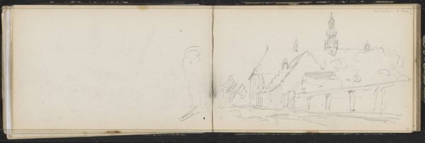 Editor: Here we have Johannes Tavenraat's "Building with a Tower in Rosenthal near Kleef," a pencil and pen drawing from 1844. It's a rather unassuming sketch, wouldn't you say? Very simple, almost like a child's drawing, but it captures something about the solidness of the building, the permanence of the tower against a sketchy landscape. What do you make of it? Curator: The apparent simplicity, as you called it, is deceptive. Note how the tower dominates, piercing the sky. Towers in art, and particularly within a Romantic frame, often symbolize aspiration, reaching for something beyond the mundane, sometimes even spiritual yearning. What feelings does the tower evoke in you? Editor: Definitely a sense of looking up, aspiration, like you said. But the loose sketchiness around it also makes me feel like it's not quite real, like a dream of a building. Curator: Dreams are a vital part of Romanticism. And it's interesting you note the sketchiness because the seemingly unfinished quality actually adds to its power. It emphasizes the idea that the building, or perhaps more accurately the *idea* of the building and tower, are in a state of becoming, of possibility. The incomplete left side might even hint at loss or the passage of time...what's missing? What could have been? Editor: So, it's not just a building; it’s more about what it represents. Maybe the building of history itself? I suppose even now buildings carry so much cultural memory. Curator: Precisely! These structures are never neutral. Their enduring presence reflects how the present is always built upon layers of the past, both real and imagined. Editor: I see it now. I thought it was just a quick drawing, but it is full of history and meaning! Thanks! Curator: It has been a delight to look at it with you. The work has encouraged me to revisit my presumptions and focus on what truly resonates within.