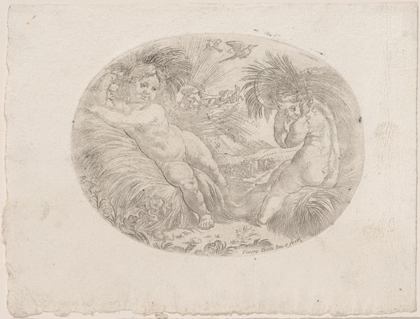 Editor: This etching is titled "Sleeping Venus Spied upon by Satyrs" by Hendrick Heerschop, made in 1652. It's incredibly detailed, especially given its monochrome palette, but it has a rather voyeuristic and, dare I say, slightly sinister atmosphere. What elements of its visual structure create that feeling? Curator: The spatial composition certainly plays a pivotal role. Observe how Venus, rendered in delicate lines suggesting vulnerable flesh, is situated diagonally across the foreground. This directs the viewer’s gaze not only to her, but also into the dark recess of the background where the satyrs are almost camouflaged by the dense etching marks describing the forest. Editor: Yes, the density of the lines around the satyrs makes them almost shadowy figures! But Venus herself seems very peacefully rendered. Curator: Precisely! Notice the contrast in textures. The flowing drapery above her contrasts sharply with the rougher, less refined etching in the lower left corner, framing the composition. The sharp angular lines of that section clash directly with the organic flow of the rest of the composition. How might that contribute to our reading of the image? Editor: It's a stark distinction. Perhaps to emphasize a contrast of beauty versus crude nature, or idealized form against a coarser reality. It calls attention to the darker desires underlying the pastoral setting. Curator: An insightful interpretation! Heerschop is adept at employing formal techniques to evoke these tensions. By using these compositional methods he creates a disquieting piece which begs questions about viewing, desire and the gaze. Editor: This has really altered how I saw it initially. Focusing on those juxtapositions has unveiled more than just a simple nude scene. Curator: Indeed. Paying close attention to line, form, and composition reveals layers of complexity and meaning that might otherwise remain hidden.