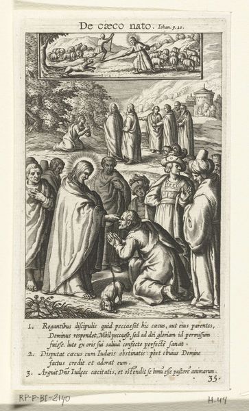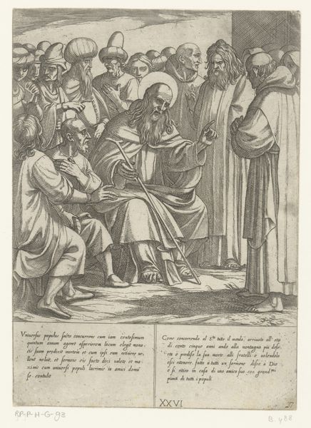 Antonio Tempesta created this engraving, "H. Antonius ontvangt brood van de monniken," sometime between 1555 and 1630. The composition, rendered in detailed lines, draws us into a scene of monks offering bread to a haloed figure, presumably Saint Anthony. Notice how Tempesta uses line to create texture and volume. The monks' robes are intricately detailed. The scene is bisected by strong verticals of the doorway, yet softened by the landscape backdrop, a curious blend of architectural structure and organic form. Tempesta plays with the semiotics of space, dividing the world into zones of activity. The foreground is crowded with figures. The background is sparsely populated, suggesting a path to solitude. This division reflects a broader artistic and philosophical concern with the contrast between communal life and individual spiritual journeys. Ultimately, the stark lines and careful composition invite us to decode the underlying symbolic structures.